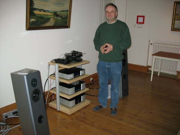 Santtu with his system - humour was a nice addition although the photo looks a bit serious! SME M10 analog player with Benz pick-up, Lindemann 820 SACD and 830 and 850 amplification with Ensemble Figura speakers gave accurate, transparent and dynamic results.