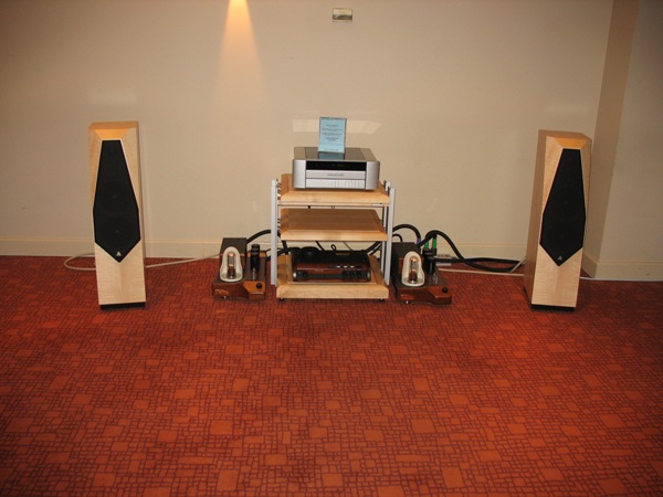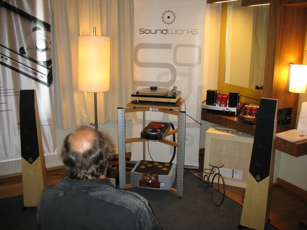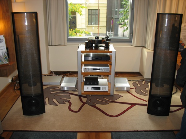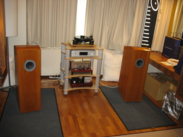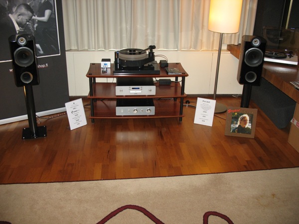 Kari Kuismanen (Hifiklinikka) had brought his monstrous system to Helsinki. The presented system was Oracle Delphi V with SME IV tonearm and Benz Ruby 3 cartridge, Conrad Johnson CT5 preamp, Conrad Johnson ET250S amplifier and Avalon Eidolon speakers. The system included incredible Trasparent Opus cabling! The Avalon Eidolon speakers didn’t match very well into the small room and they could deliver only a part of their true potential. I’m sure Kari knew this already in advance but wanted anyway to show his system. The main reason for this kind of presentation might well be making contacts. The front end with Oracle Delphi player seemed to work excellently. Because of the “vinyl only” presentation I could not evaluate the over-all sound very deeply, but the sound was anyway among (only) the best ones.