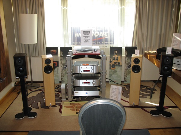 Jari Kastikainen (Audiostar) and Jorma Salmi (Gradient) had managed to setup a nice system and especially a great room/speakers combination! The sound was great, balance and clarity was clearly among the best ones in the show. System consisted of Accuphase DP-500 CD-player, Accuphase E-450 integrated amp, Gradient Laura speakers and Supra Classic cabling.